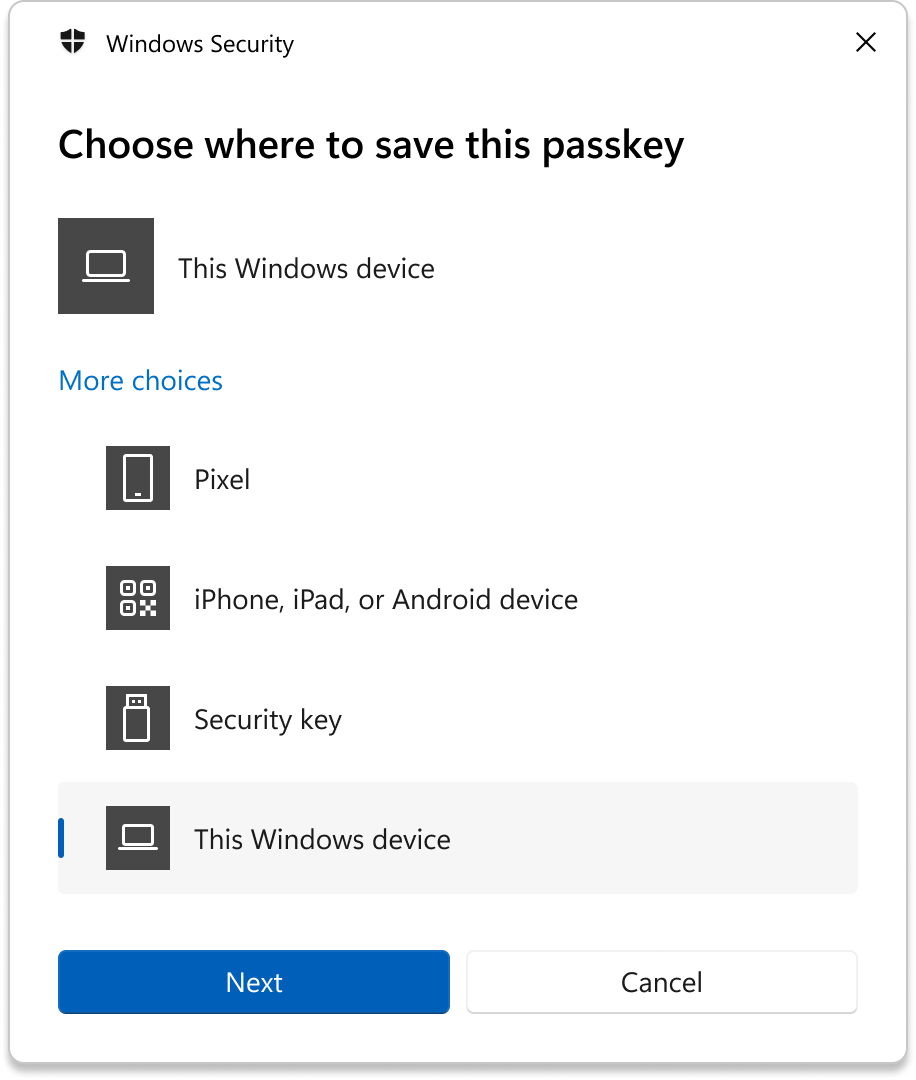 Note: Starting in Windows 11, version 22H2 with KB5030310, Windows provides a native experience for passkey management. However, passkeys can be used in all supported versions of Windows clients.